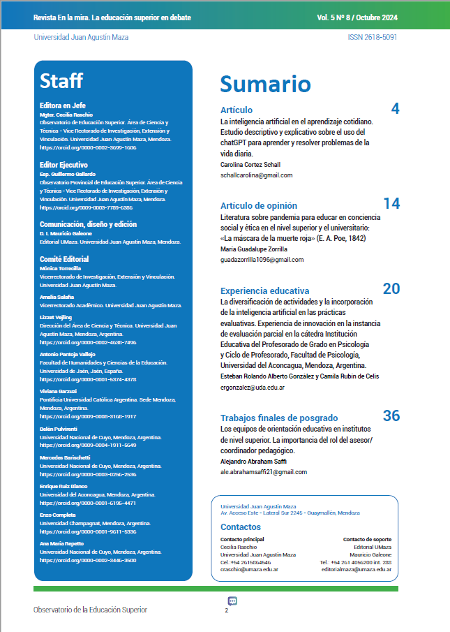 UMaza, E. (2024). Sumario. Revista En La Mira. La educación Superior En Debate, 5(8), 2–3. Recuperado a partir de https://umaza.ojs.theke.io/enlm/article/view/522