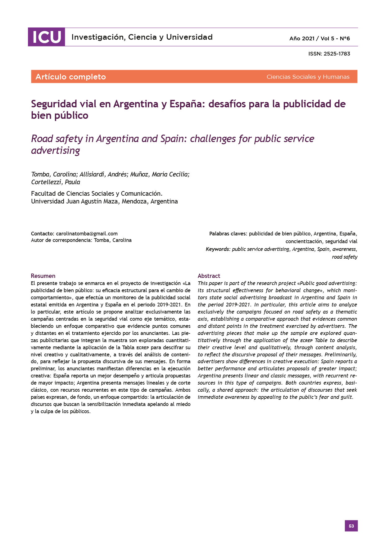 La seguridad vial continúa siendo una de las problemáticas sociales más alarmantes en todo el mundo. En el marco del proyecto de investigación sobre campañas de bien público analizamos de forma comparativa las campañas de Argentina y España sobre esta problemática. Las piezas publicitarias son exploradas cuantitativamente para descrifrar su nivel creativo y cualitativamente, para reflejar la costrucción de mensaje. En forma preliminar, los anunciantes manifiestan diferencias en la ejecución. España reporta un mejor desempeño creativo y una mirada amplia del problema. Argentina reproduce el código característico que es discutivo por diversos autores. Será necesario profundizar en la reflexión teórica y ajustar futuras campañas para lograr un verdadero compromiso con la solución.