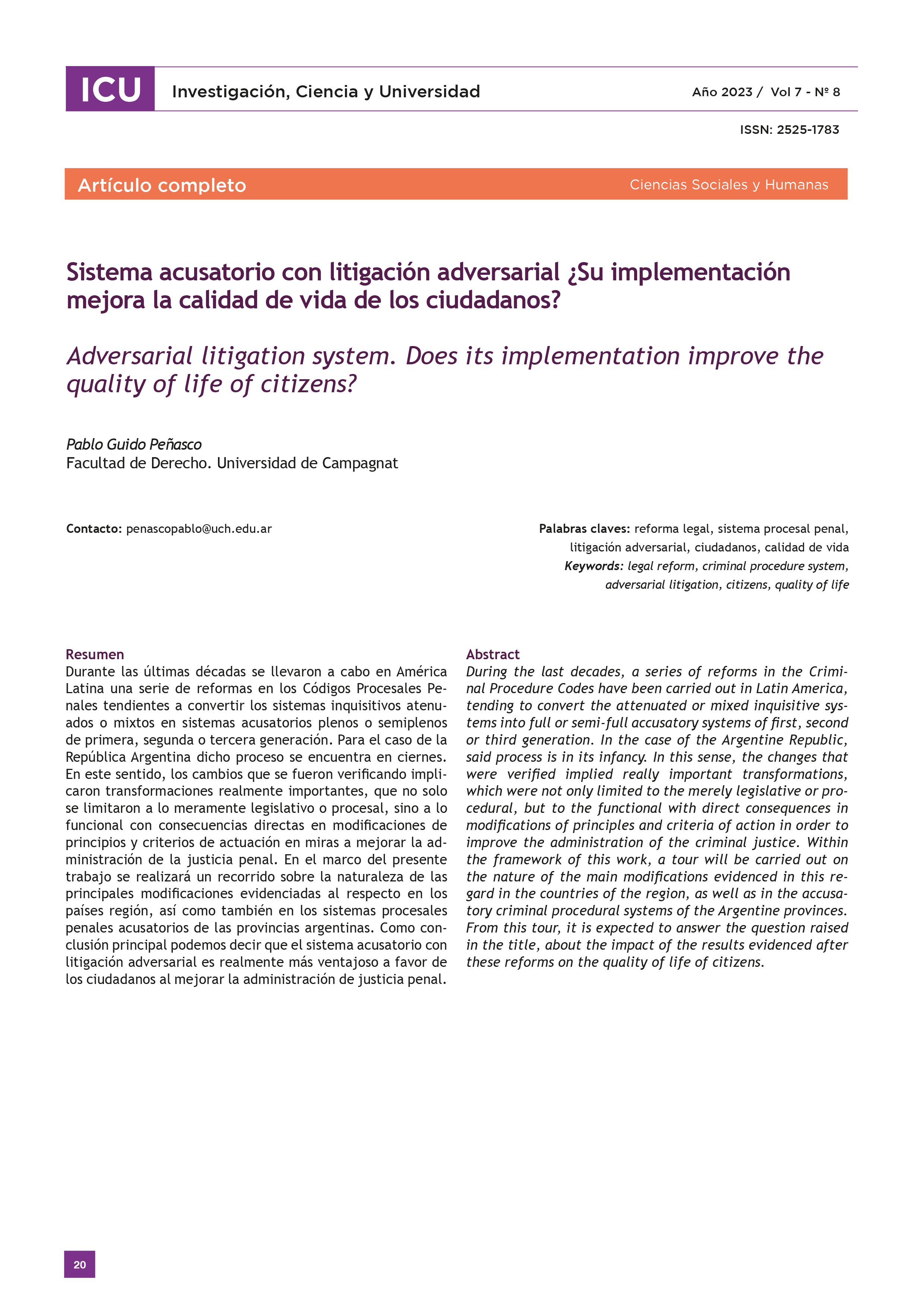 Este N°8 enfoca sus artículos en problemas que afectan la calidad de vida de los ciudadanos. En temáticas de salud pública, contiene un artículo sobre el consumo de drogas en jóvenes de Mendoza y sus prevalencias. Otro tema de salud publicado refiere a la relación entre el consumo de vino, el perfil lipídico y las adipoquinas en varones evaluando las cantidades de ingesta adecuadas. En las ciencias ambientales, se publica un artículo que se desprende de un trabajo de investigación cuyo objetivo fue diagnosticar la fitotoxicidad del agua de riego de la ciudad de Mendoza y en base a ello confeccionar un mapa de riesgo urbano. Desde las ciencias sociales se tratan dos temas importantes para el desarrollo de la ciudadanía: por una parte las bancas éticas y finanzas sustentables, como desafíos para superar las limitaciones y desigualdades ocasionadas por el sistema financiero tradicional y por otra parte, la litigación adversarial haciendo un recorrido por los sistemas procesales en Argentina y la región.