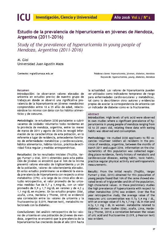 • Estudio de la prevalencia de hiperuricemia en jóvenes de Mendoza, Argentina (2011-2016)